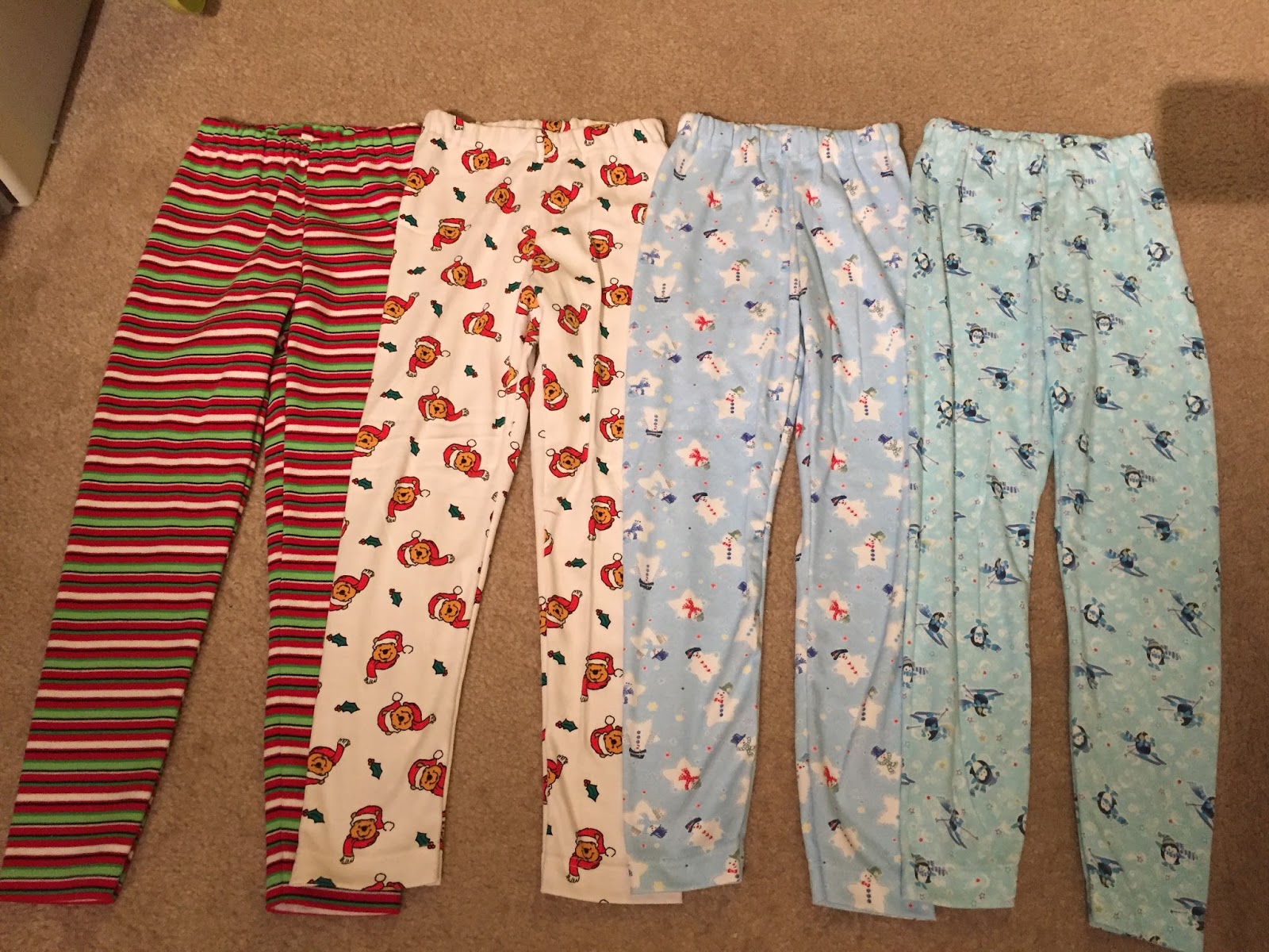 I did manage to make Katie some leggings. The two pairs on the left are day wear, but the two pairs on the right are a super soft knit I got ages and ages ago at a fabric store in Reno, and those are PJ pants.