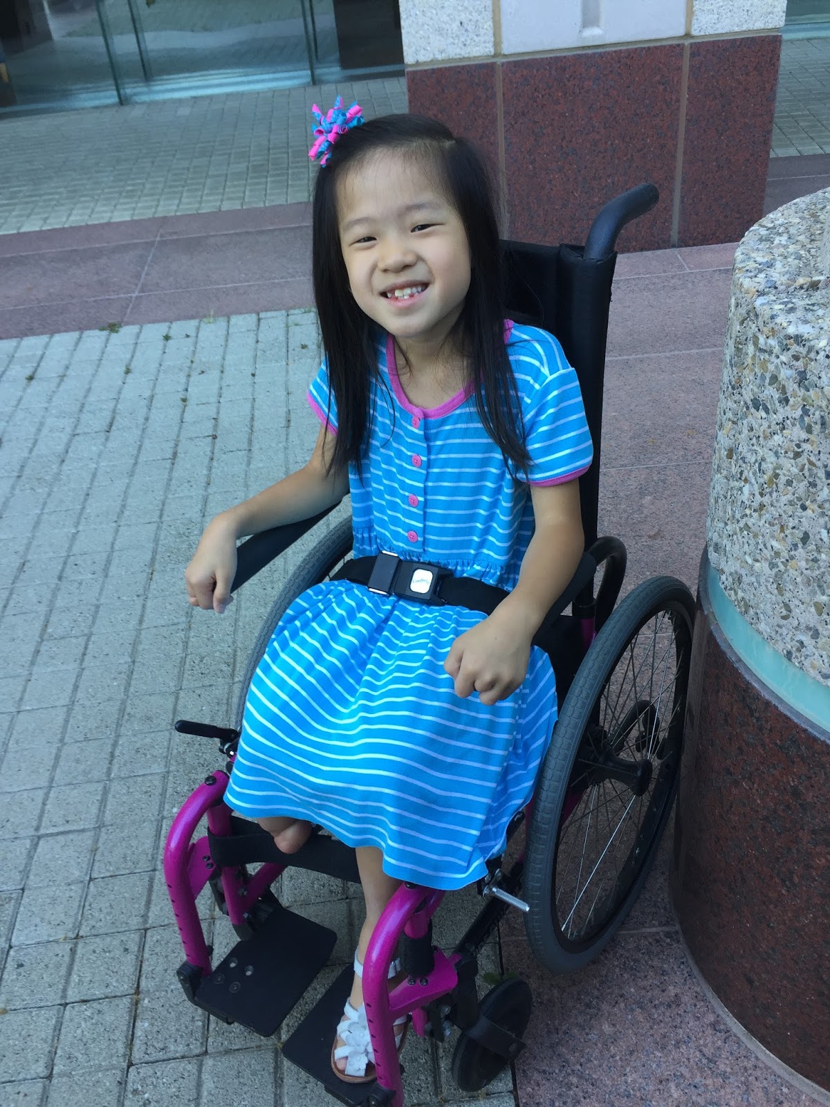 I introduced her to waiting room selfies. Fortunately, Shriners was able to squeeze us in and replace the button assembly and she walked out a happy camper.